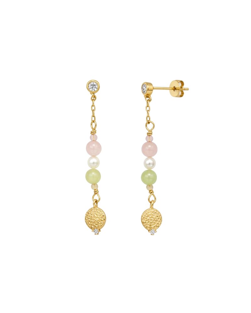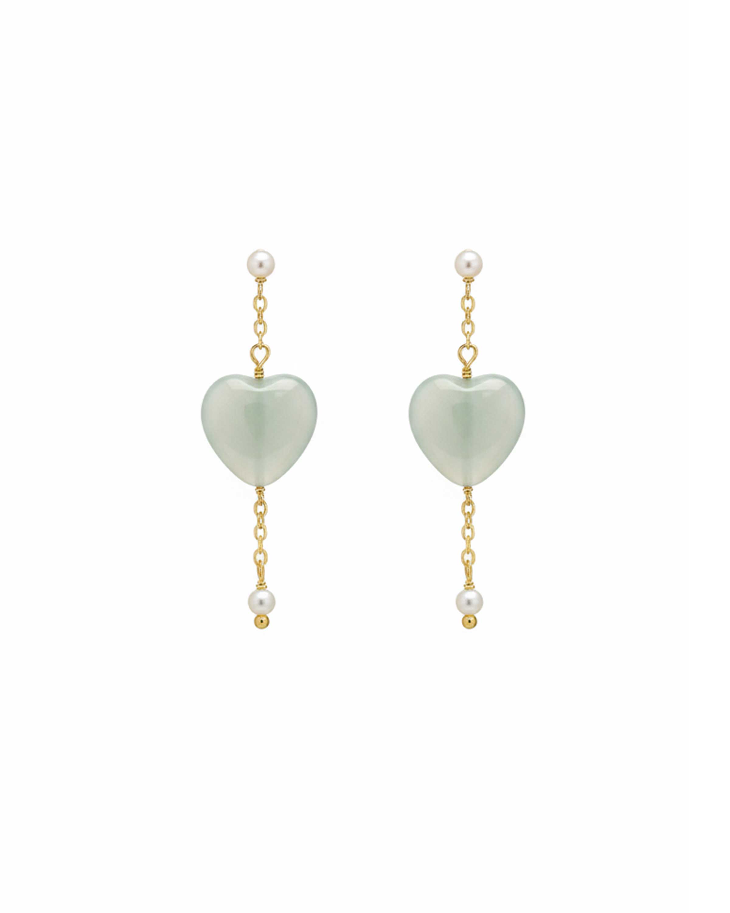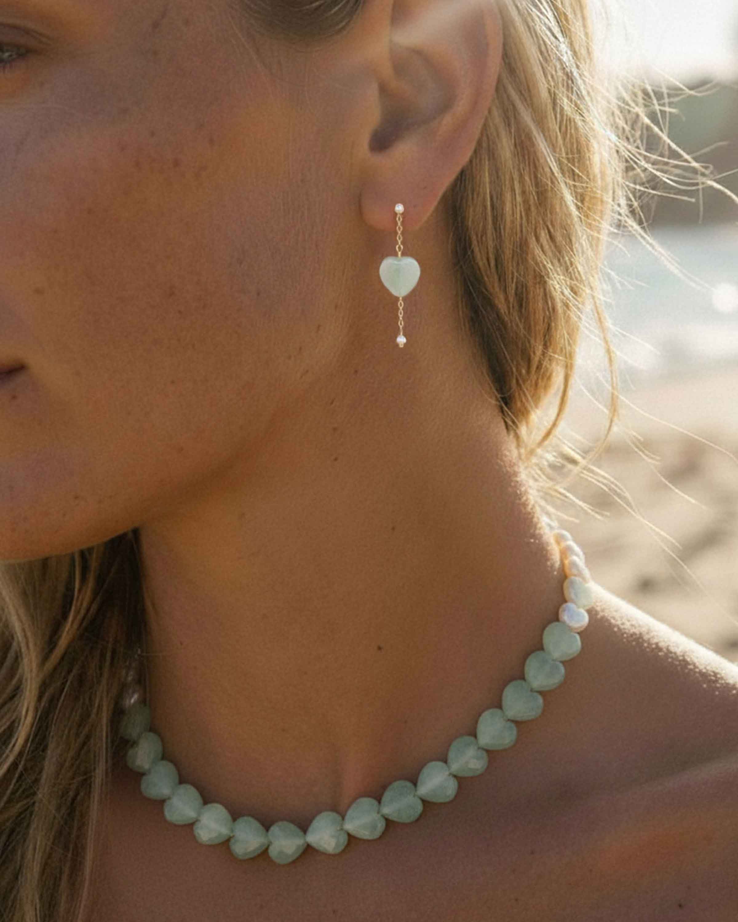 The Aura Heart Aventurine earrings feature a romantic, whimsical design centered around beautifully polished heart-shaped stones. Suspended from delicate chains and accented with luminous pearls, these long-drop earsticks combine soft green tones with a classic luster for a feminine and meaningful statement.