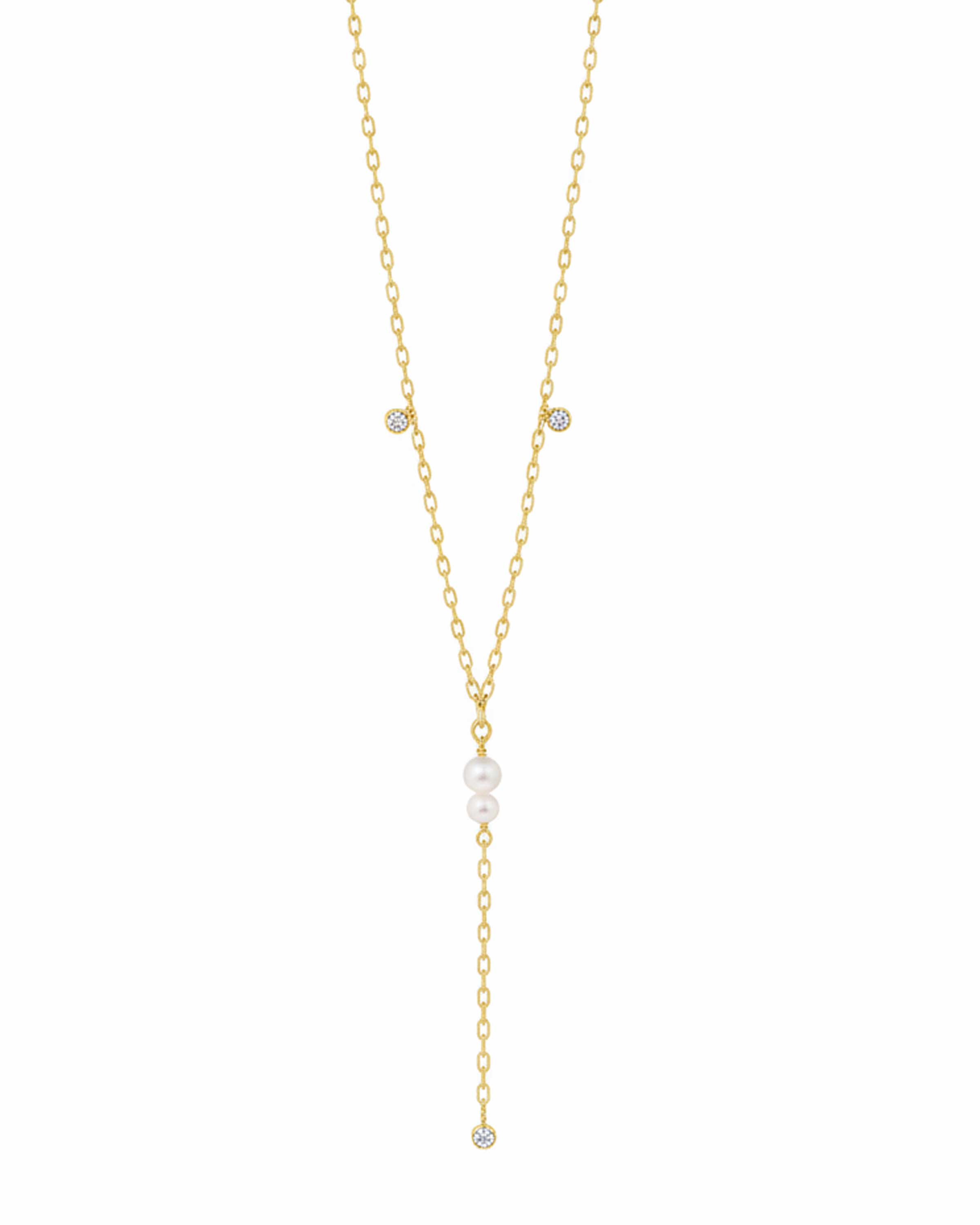 The Aura Y-Necklace features a delicate, elongated design adorned with shimmering accents and twin pearls that meet at a graceful focal point. This piece offers a sophisticated, drop-style silhouette that perfectly complements plunging necklines or adds a touch of refined detail to everyday wear.