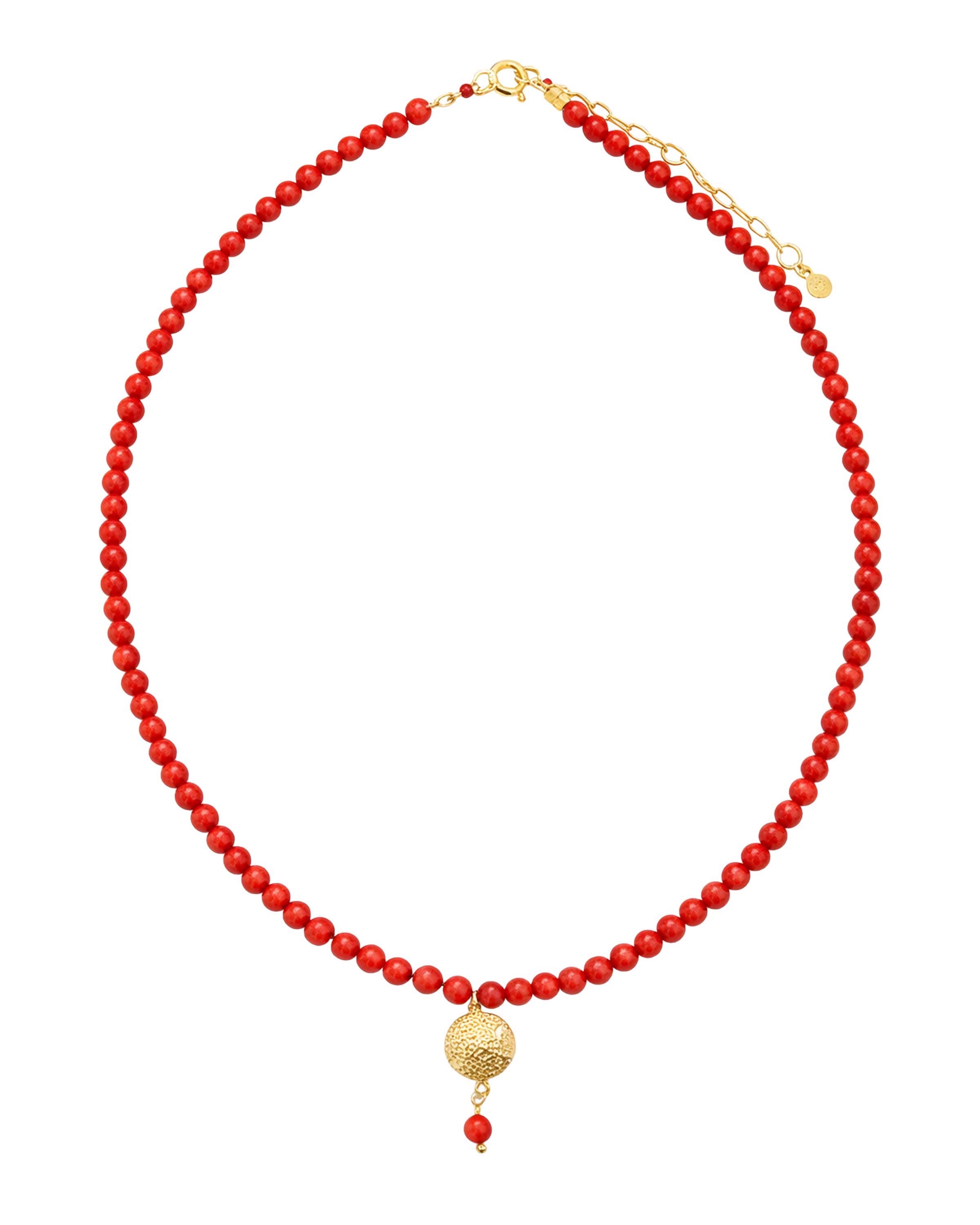 Radiating with the bold energy of the sun, the Sol Red necklace features a striking strand of vibrant red beads that make a powerful, warm statement. This piece is anchored by a uniquely textured gold disc and a matching red bead drop, capturing a look that is both modern and full of character.