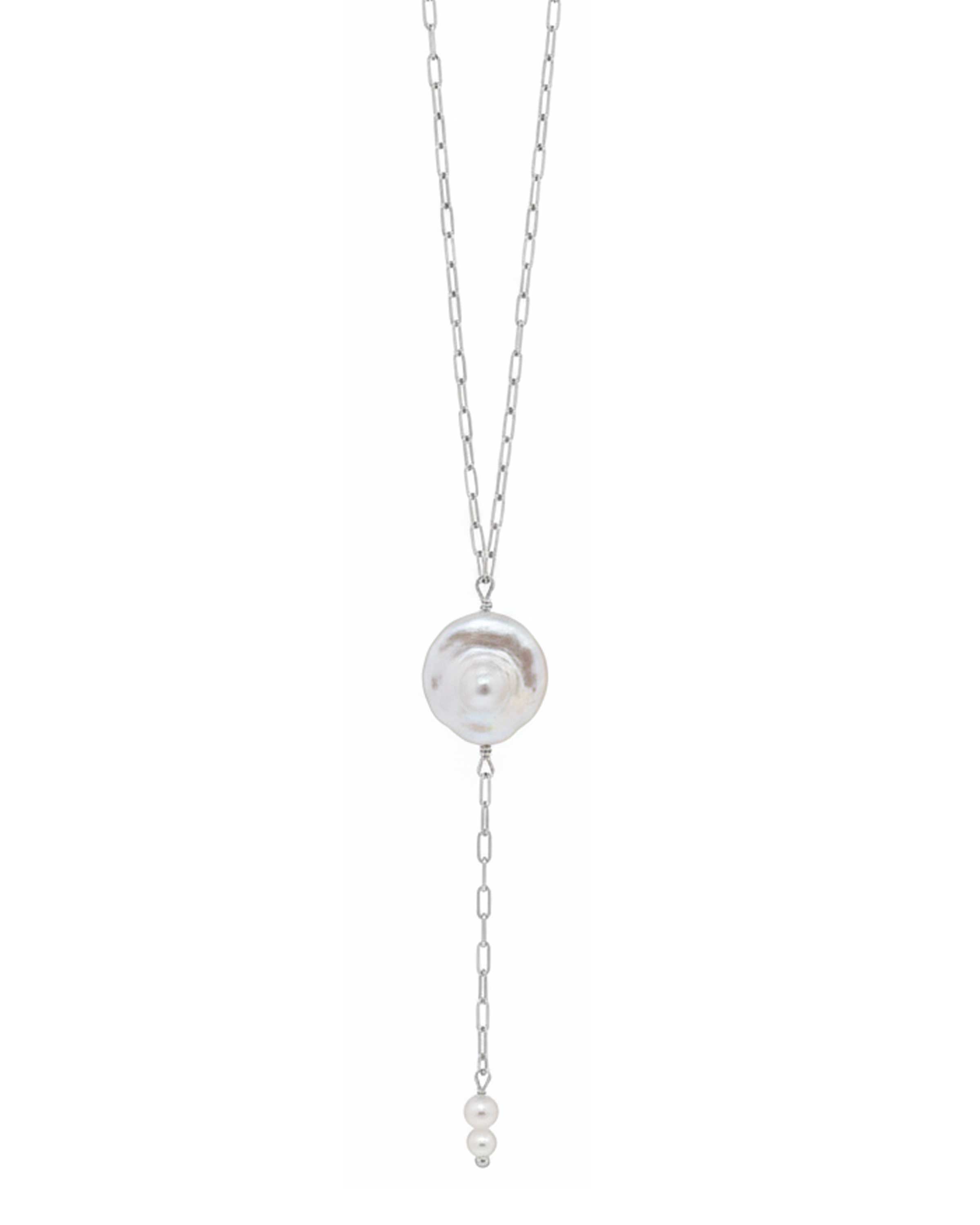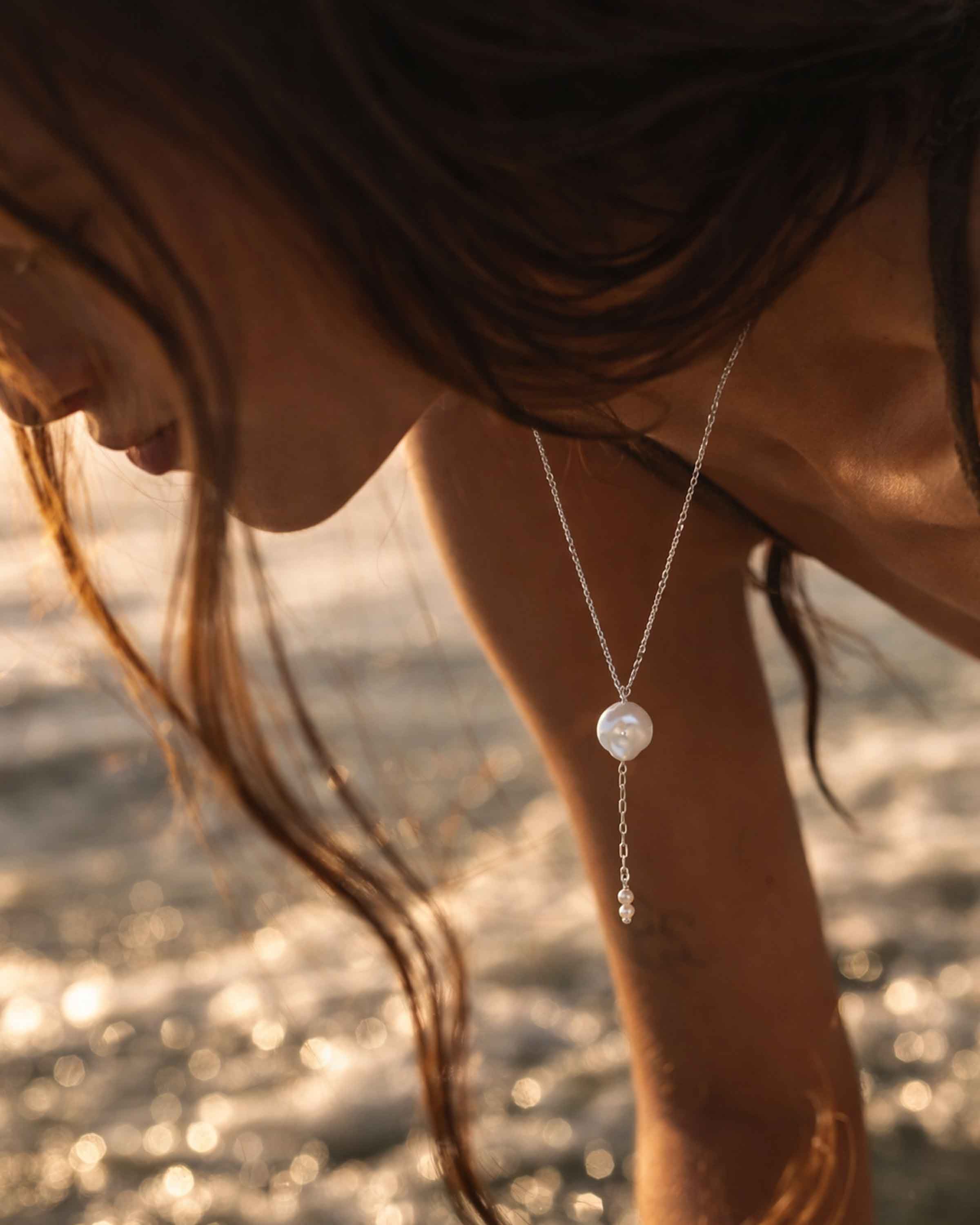The Luna Pearl Drop necklace features a striking, organic design that balances the bold presence of a central baroque pearl with the delicate grace of a trailing chain. It’s a versatile statement piece that brings a modern, oceanic elegance to any neckline.